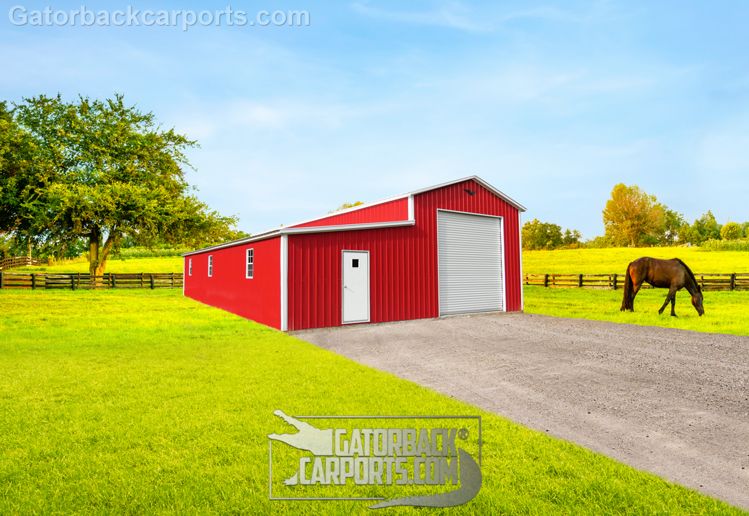 This 35x50x13/8 Garage with Lean-To is built with a White Vertical Style Roof with White Trim, 8′ Eave Leg Height, (1) 15’x50’x8’ Fully Enclosed Left Lean-To with (3) 24”x36” Windows and (1) Walk-in Door, 13′ Center Section Eave Leg Height, Patriot Red Ends Closed Vertically, (1) 12’x12’ Garage Door, (12) 14’x12’ Custom Frameouts, Concrete Anchor Package with a Flush Mount Kit and is Engineer Certified for 140MPH / 35PSF.