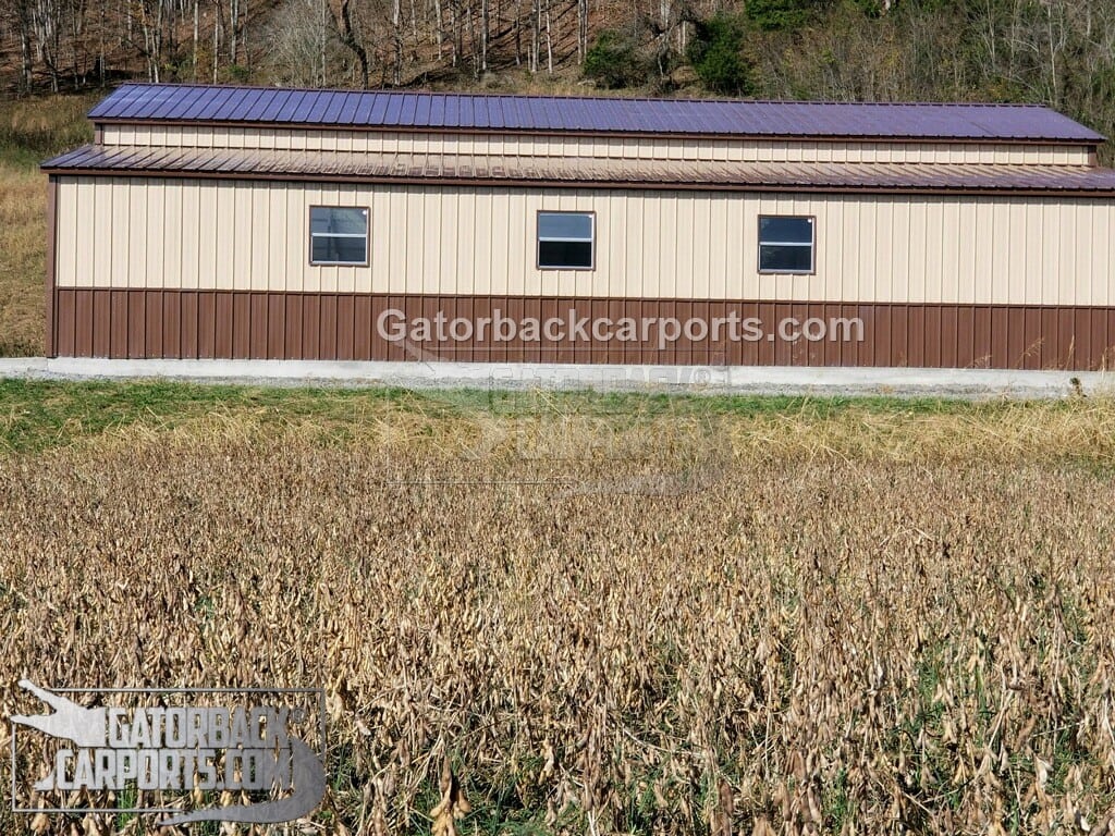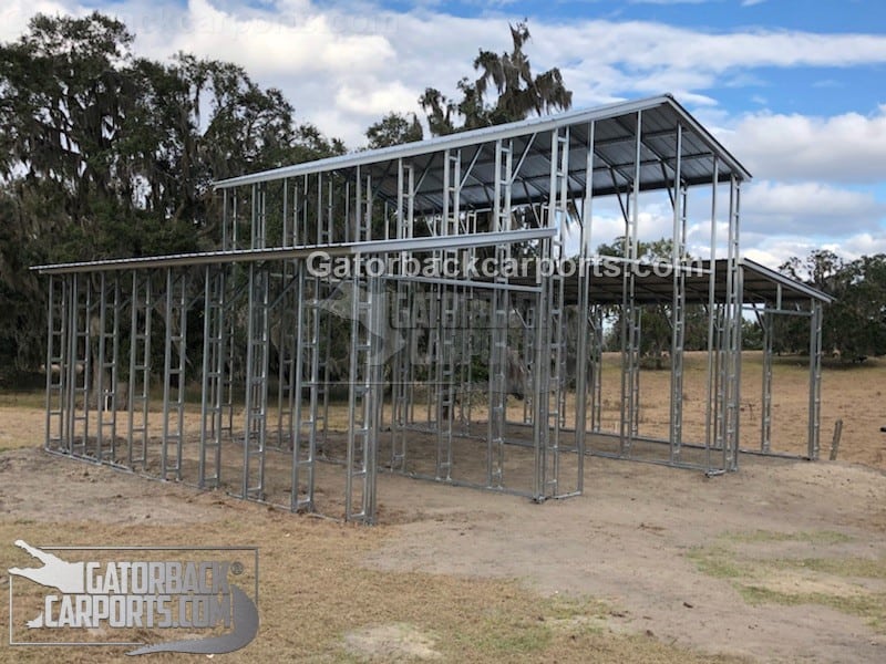 We can also build much larger buildings 50×80, 60×100, 60×120, 60×140, 60×160, 60×180, 60×200, 60×300. Our metal garages stop at a width of 60 and up to 80 feet in some areas, but our barns can be built wider because of the side wall attachments which are lean to’s as the building seen below.