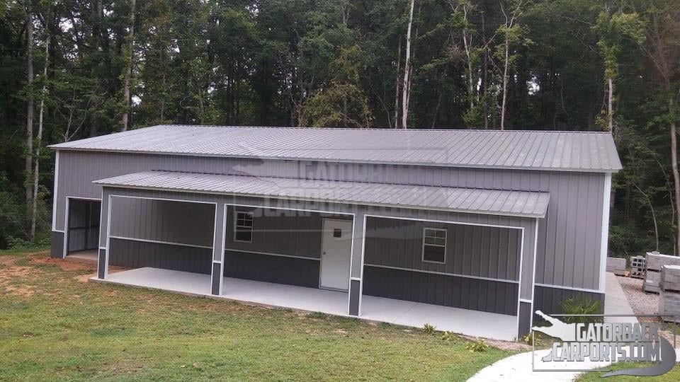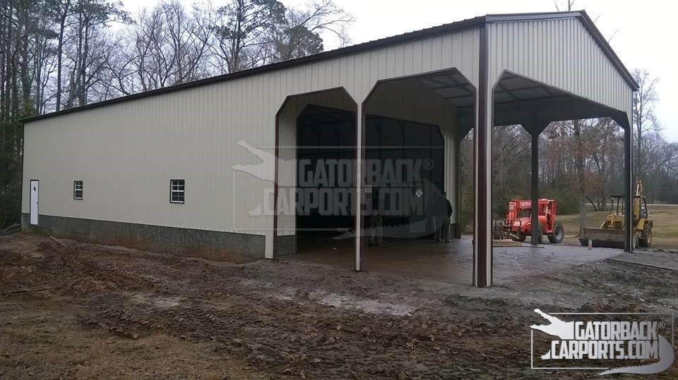 Seen Below: Workshop with Large Open Carport attached on the end with Gable and double side frame outs, post are trimmed and come with 45 degree angle trim