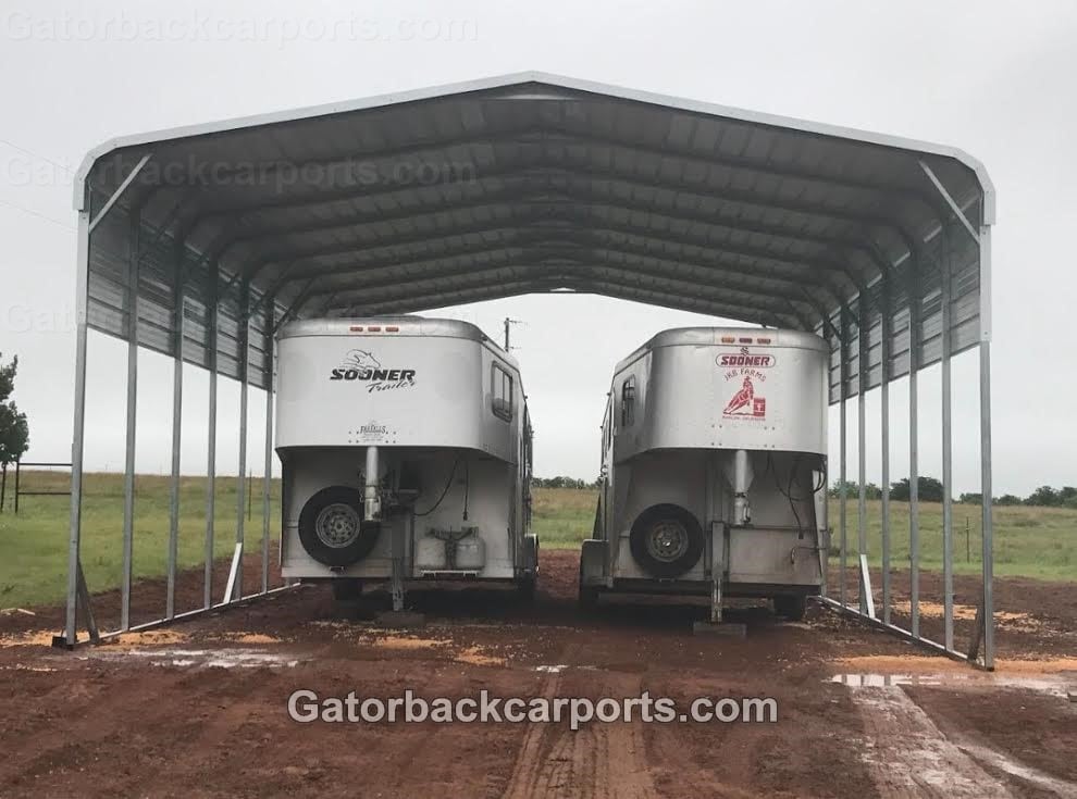 Horse Trailers can be a costly investment, and insuring the longevity of your live stock trailer starts with a quality metal horse trailer shed as the one pictured below. This horse trailer carport or stock trailer shed is a regular roof system which means the roof panels are hung horizontally. Horizontal panels run the length of the carport whereas a vertical roof carport has panels that run from the center of the roof line at ridge and the panel ends are covered with a ridge cap.