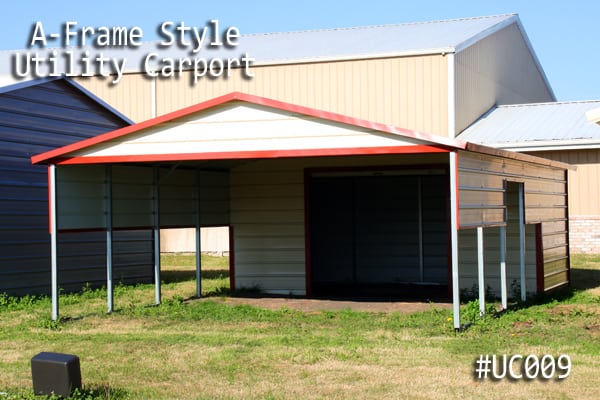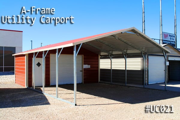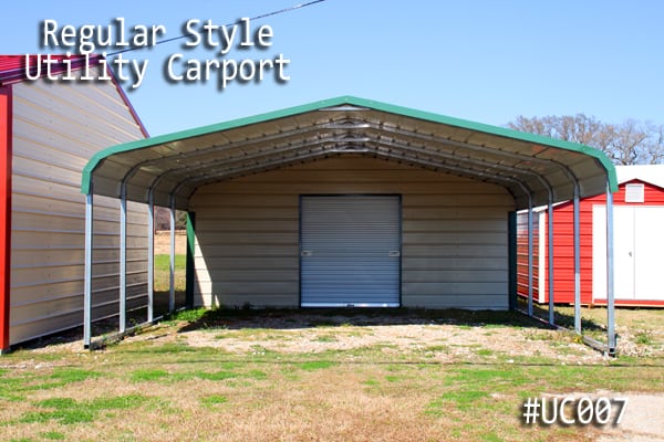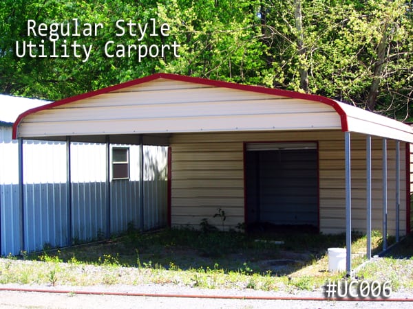 Our Regular Style Metal Carport Combo Unit, with a Standard Rolled-Corner Type, this Combo Unit features a standard Horizontal Roof. The Roof Panel runs parallel to the side of the Building. Therefore water is going to drain to the front or the back of the Building. You may consider ordering a combo unit with our boxed eve, or vertical style roofs for even extra benefits. These Roof Styles come with an A-Frame structure or normal house roof style than the Regular Style Metal Wrap Around Building. Order the Boxed Eave or vertical roof if your trying to match the style of your house or other buildings on your property.