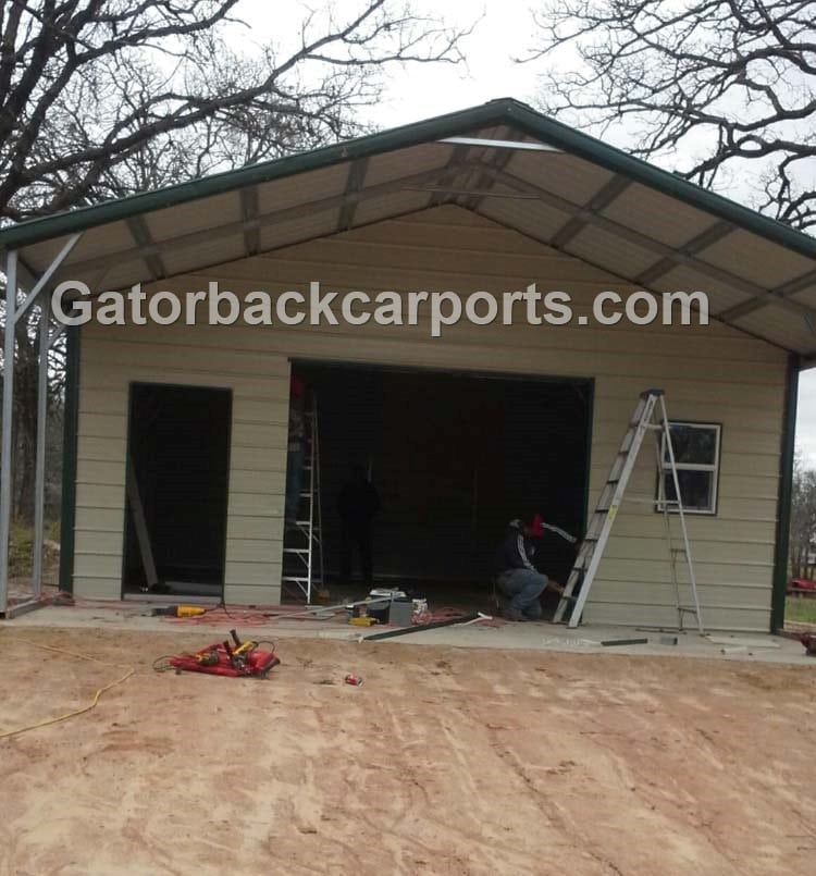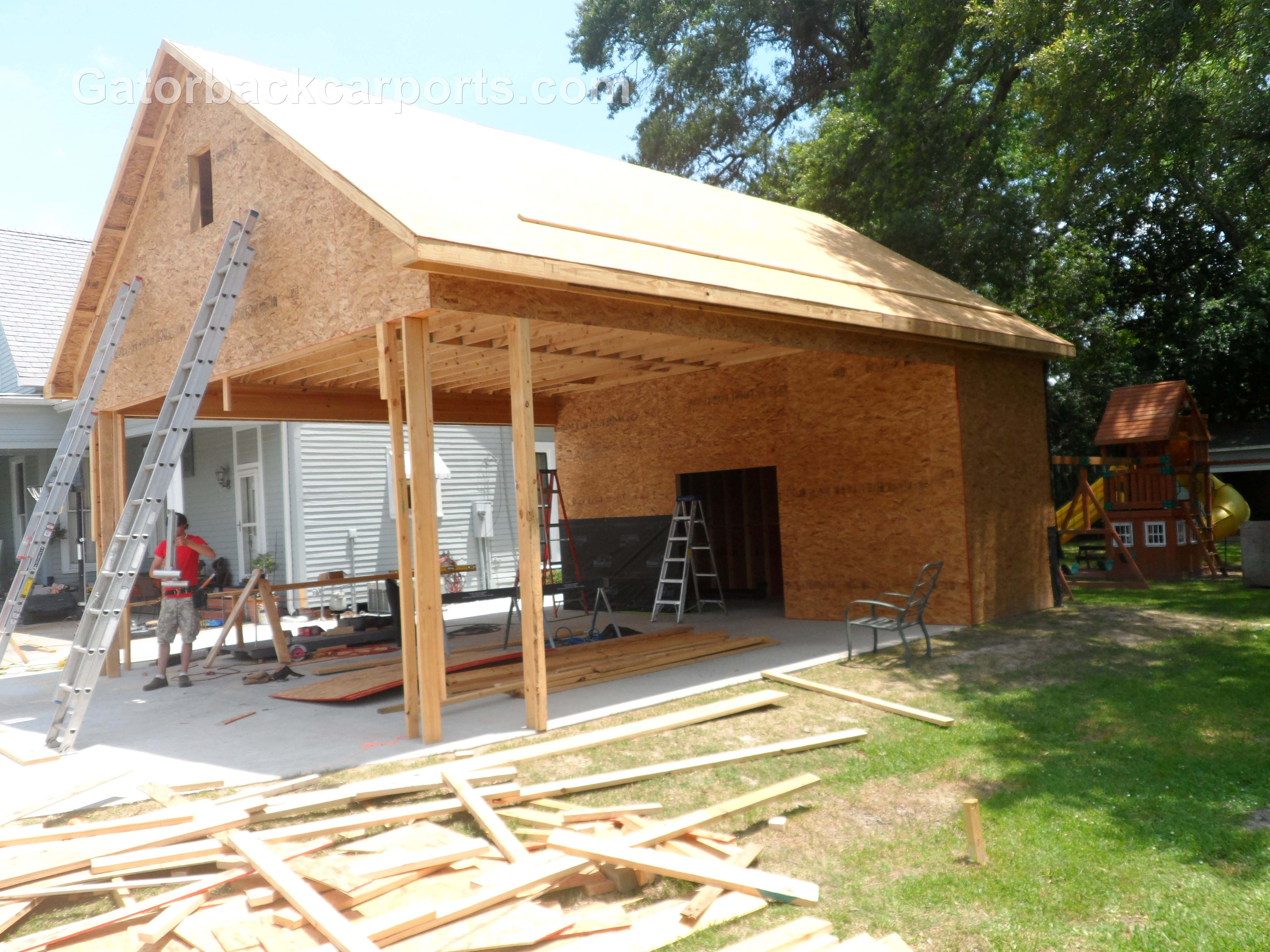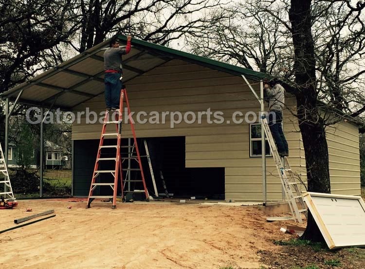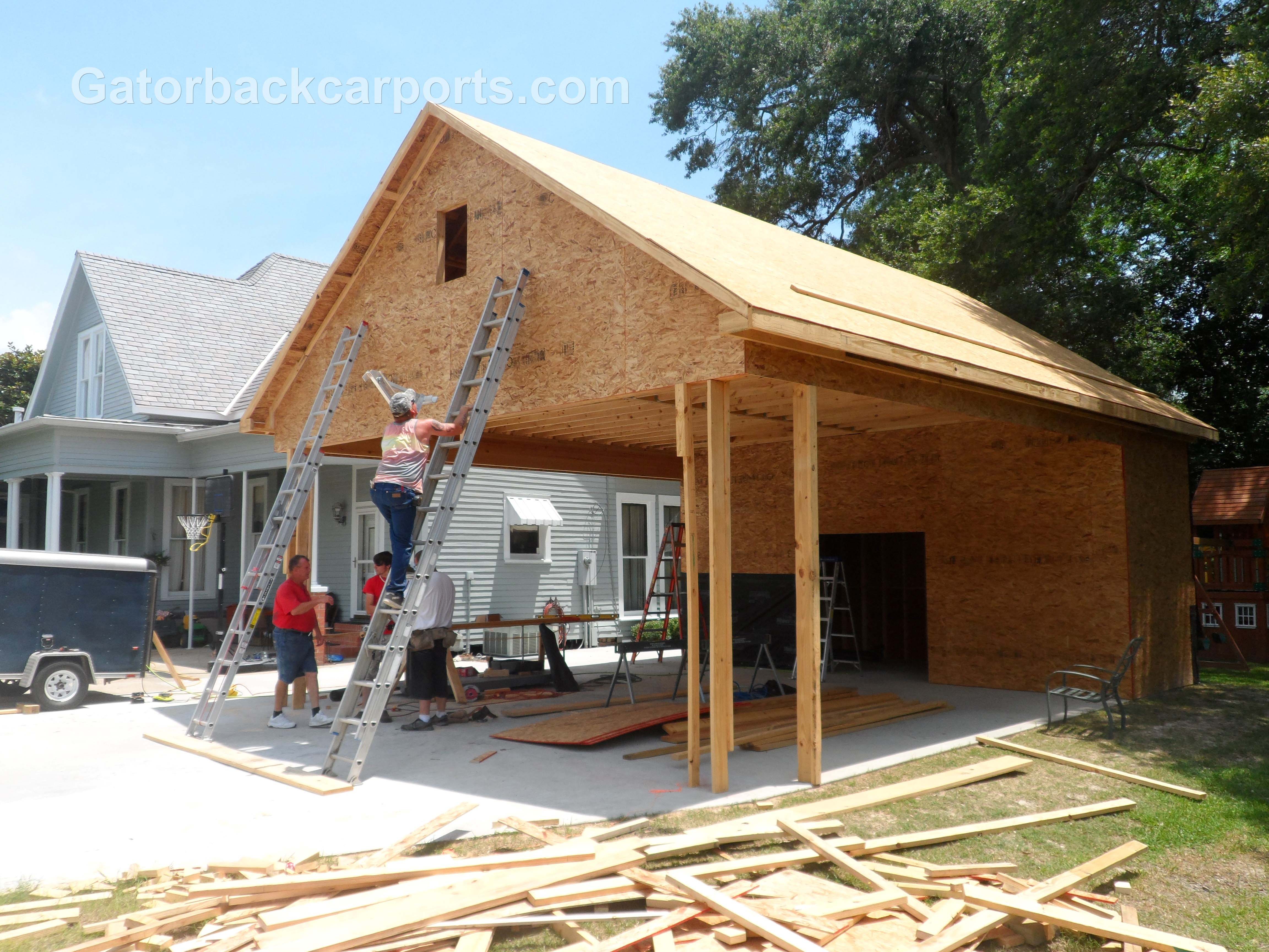 The picture above is a wood frame Garage with Carport Cover parking. In the metal building industry we call that a combo unit. Which means that an enclosed building (garage) is combined with a carport. One can see the extensive amount of labor involved in this traditional wood structure, and why it would cost 50% or much more to construct. This job which was monitored by Gatorback Carports took weeks to complete. In contrast the metal combo unit pictured below only took a day to construct because the majority of the work was accomplished at our manufacturing plant in the prefabrication process.