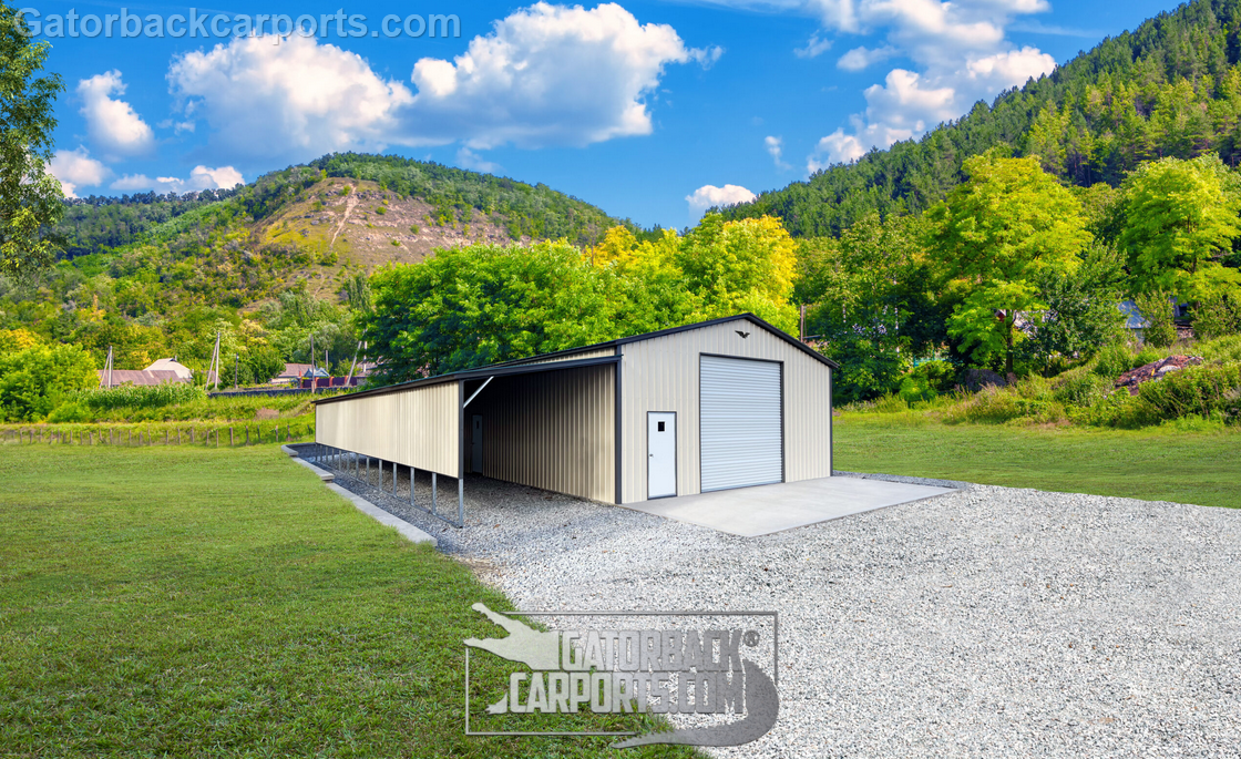 This 42x60x12/9 Metal Workshop is built with an Evergreen Vertical Style Roof with Black Trim, 9′ Eave Leg Height, (1) 12‘x40′ Left Lean-To with 6’ Side Panel, 12′ Center Section Eave Leg Height, Pebble Beige Sides and Ends Closed Vertically, (1) 12’x12′ Garage Door, (2) Walk-in Doors, Concrete Anchor Package and is Engineer Certified for 140MPH / 35PSF.